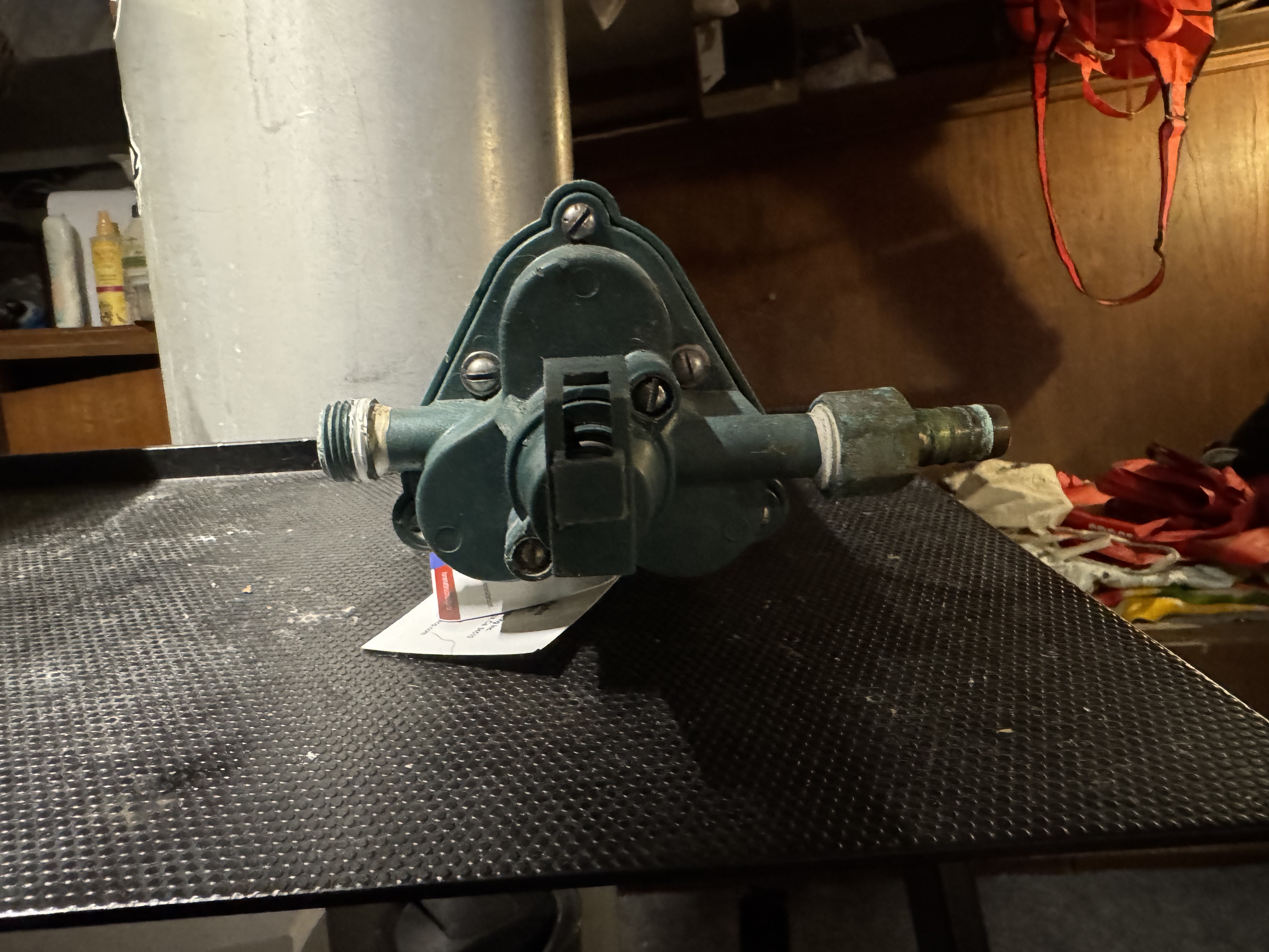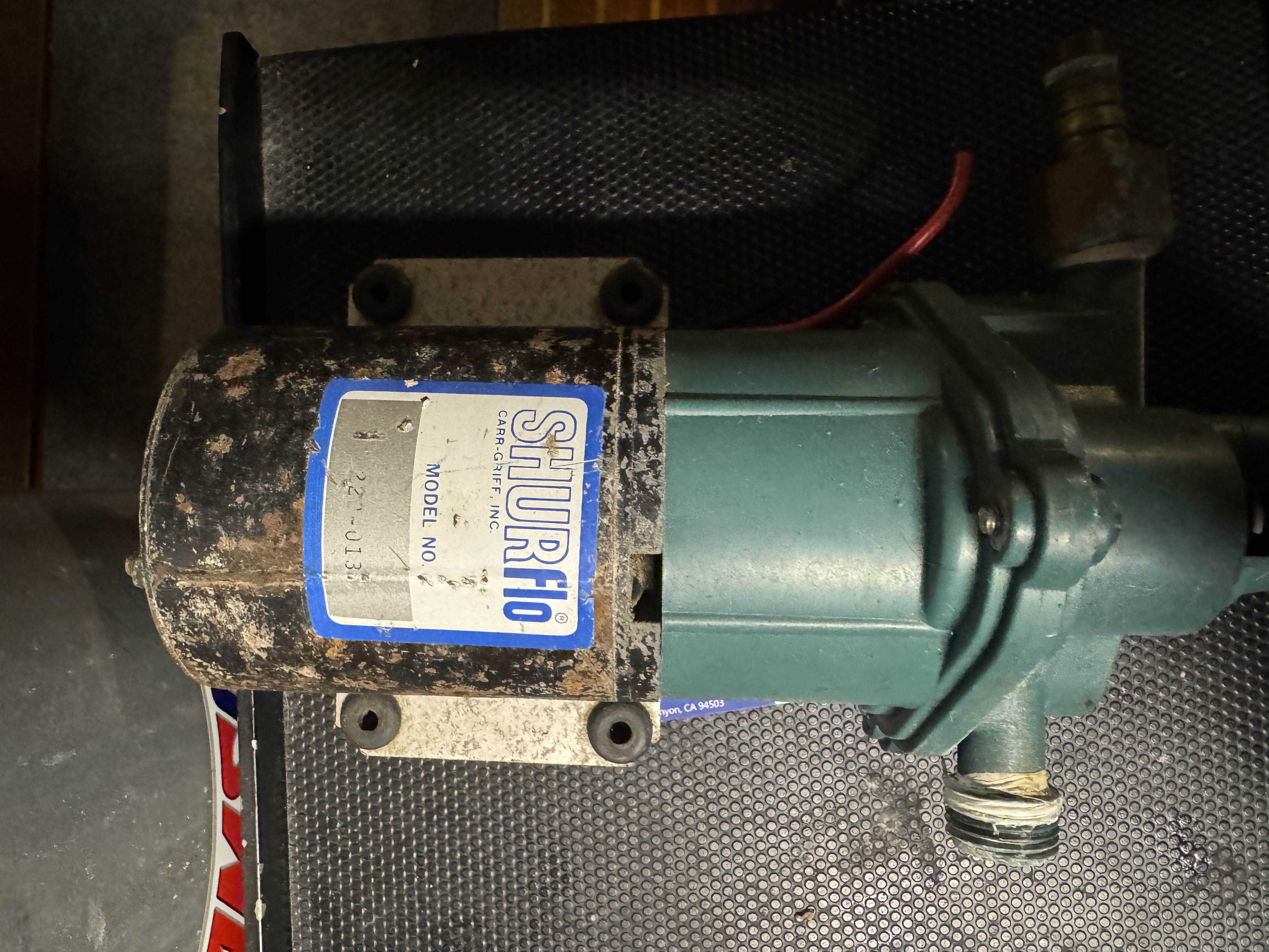 A used 12V DC marine water pump by Shurflo, commonly found in boat freshwater and washdown systems. The pump shows visible corrosion and wear consistent with field use, with intact plumbing fittings and electrical connections. Includes mounting bracket and associated hardware.