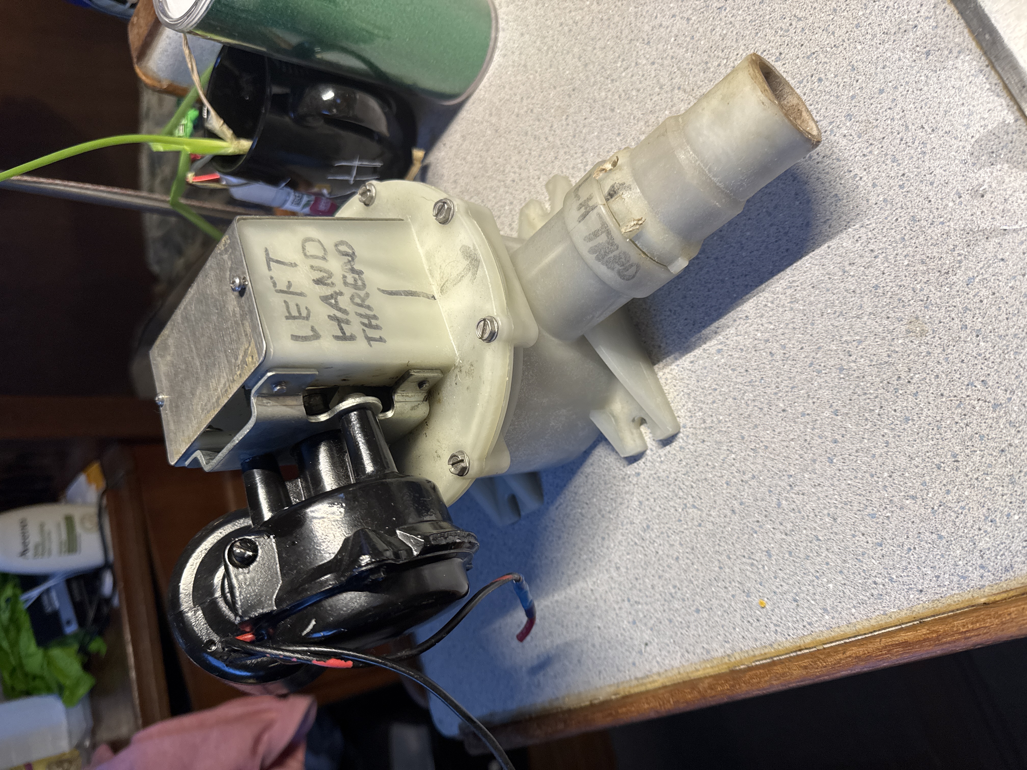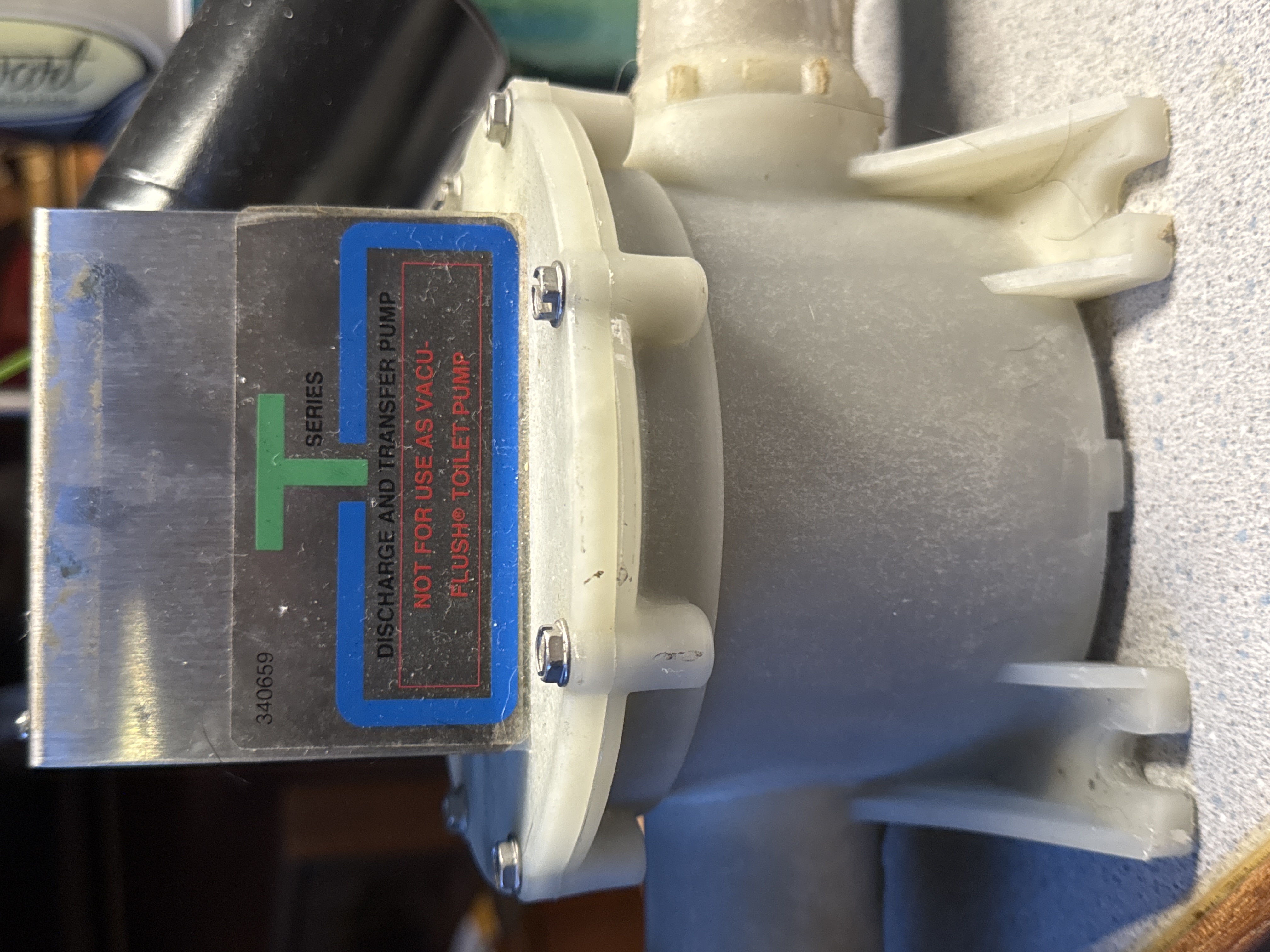 This is a T-Series discharge and transfer pump designed for marine applications such as bilge or galley use. The label clearly indicates it is NOT for use as a Vacuflush toilet pump. The pump features a cream-colored plastic housing with a black motor assembly and blue wiring, and shows signs of regular use with some surface wear and minor corrosion.